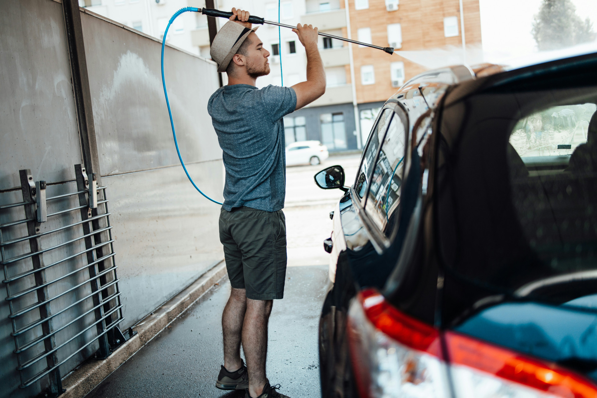 Hold altid passende afstand til overfladen, og start med lavt tryk. Brug brede dyser til sarte materialer som træ og bilkarosseri, og undgå at pege strålen direkte mod fuger eller maling, der kan løsne sig.